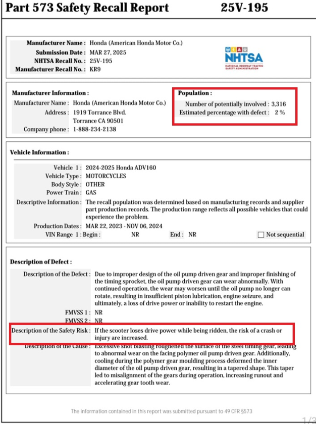 Hasil investigasi dan keputusan recall Honda ADV160 dari NHTSA, Komisi Nasional Keselamatan Berkendara Amerika