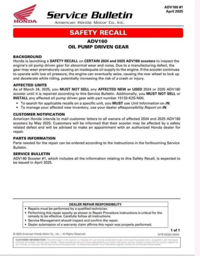Secara resmi juga American Honda Motorcycle mengumumkan recall Honda ADV160 karena masalah gir pompa oli.