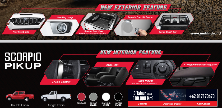 Jika melihat data spesifikasi dari laman web resmi Mahindra.id, kendaraan Mahindra Scorpio menawarkan dua varian yaitu Double Cabin dan Single Cabin, yang mempunyai fitur yang sama.