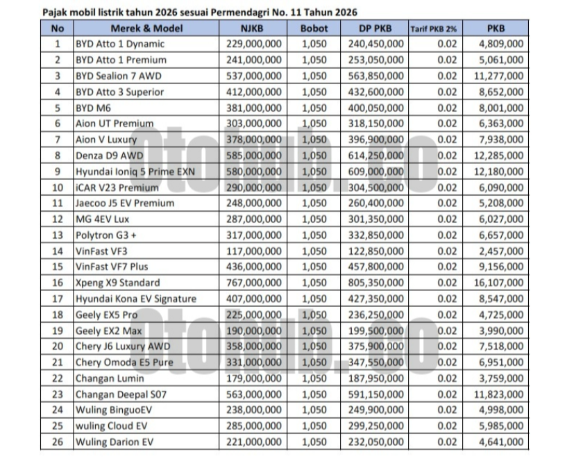 Sebelum mendapatkan insentif dan berdasarkan metode perhitungan PKB sesuai Permendagri No 11 Tahun 2026, maka pajak mobil listrik terpantau lumayan tinggi.