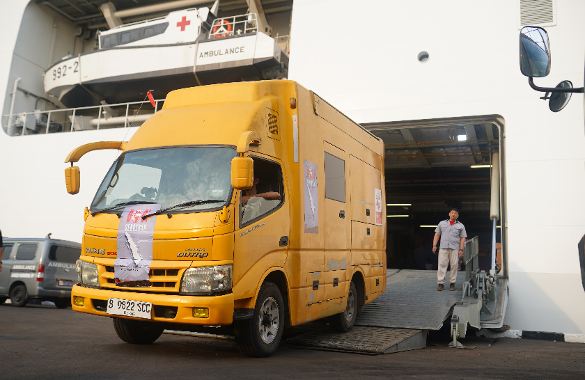 Logistik ini akan didistribusikan ke wilayah terdampak melalui kapal Rumah Sakit Apung, KRI dr. Radjiman Wedyodiningrat.