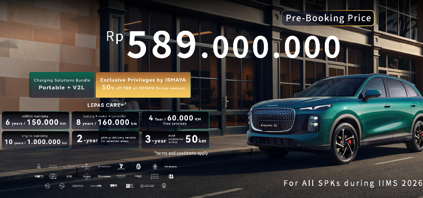 Salah satu penawaran utama di IIMS 2026 adalah harga spesial pre-booking LEPAS L8 sebesar Rp 589 juta yang memberikan kesempatan lebih awal bagi pelanggan.