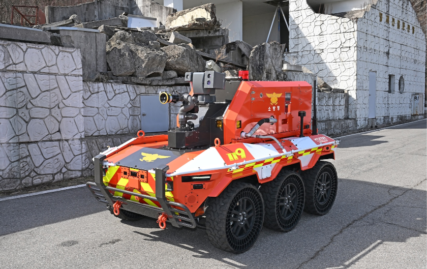 Robot Pemadam Kebakaran Tanpa Awak dikembangkan melalui kolaborasi dengan Badan Pemadam Kebakaran Nasional Korea Selatan dan berbasis kendaraan tanpa awak multifungsi bertenaga listrik HR-Sherpa milik Hyundai Rotem.
