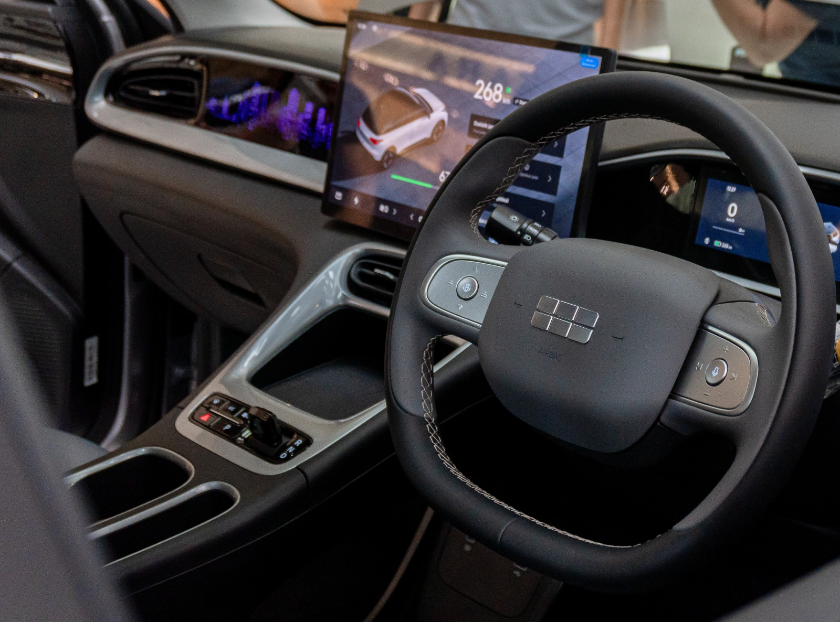 Interior Geely EX2 dilengkapi dengan tuas transmisi kristal, Urban Starlight Ambient Lighting 256 warna, layar sentral HD 14,6 inci, dan sistem infotainment Flyme Auto yang intuitif.