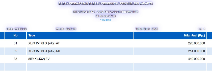 Harga Suzuki eVitara (81E1X (4x2) EV) terciduk sudah tertera di web Samsat PKB Jakarta
