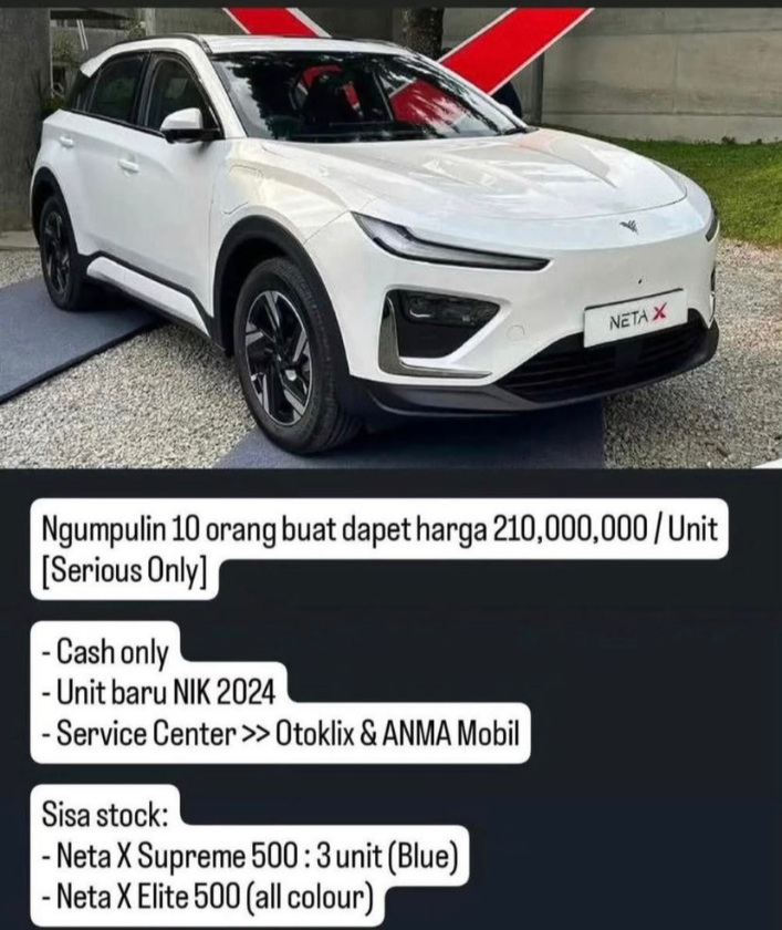 Tertera pada foto, "Dijual 10 unit dengan harga Rp 210 juta per unit. Cash only NIK tahun 2024. Neta X Supreme 500, 3 unit warna Blue dan Neta X Elite semua warna ada," tulisnya.