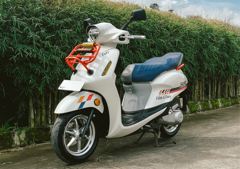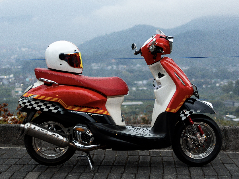 Dengan beberapa sentuhan modifikasi tipis yang memadukan warna dasar putih dengan warna merah di bagian rak depan dan biru untuk jok tebal dengan patch JDM khas skutik Jepang serta beberapa grafis yang menyebutkan identitas skutik ini, yaitu Kumo dan stiker decal tulisan Jepang untuk mempertegas identitasnya.