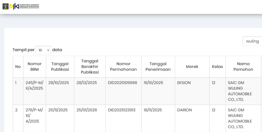 Dalam laman resmi PDKI tersebut, terlihat merek dagang Eksion didaftarkan oleh SAIC GM Wuling Automobile Co. Ltd.
